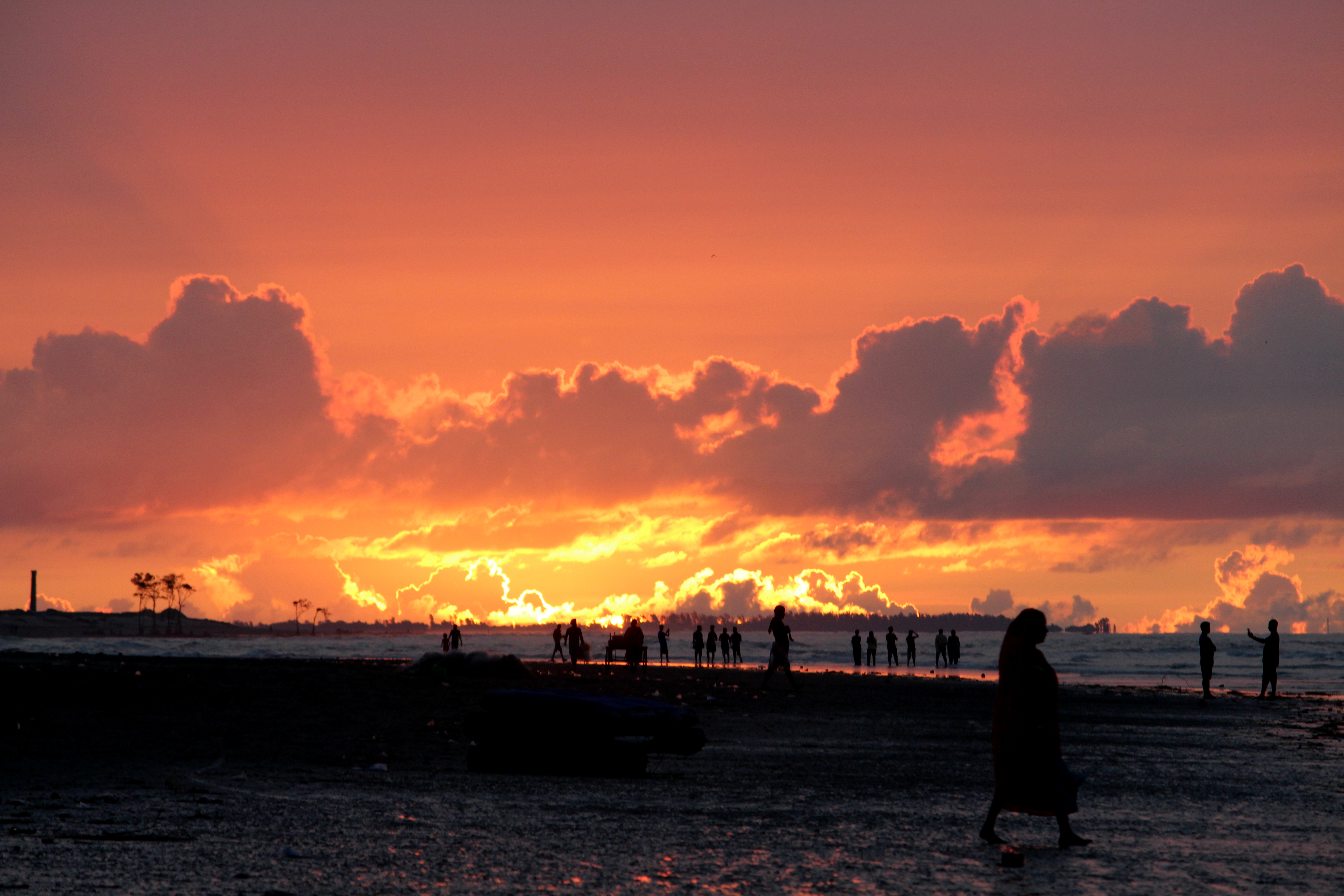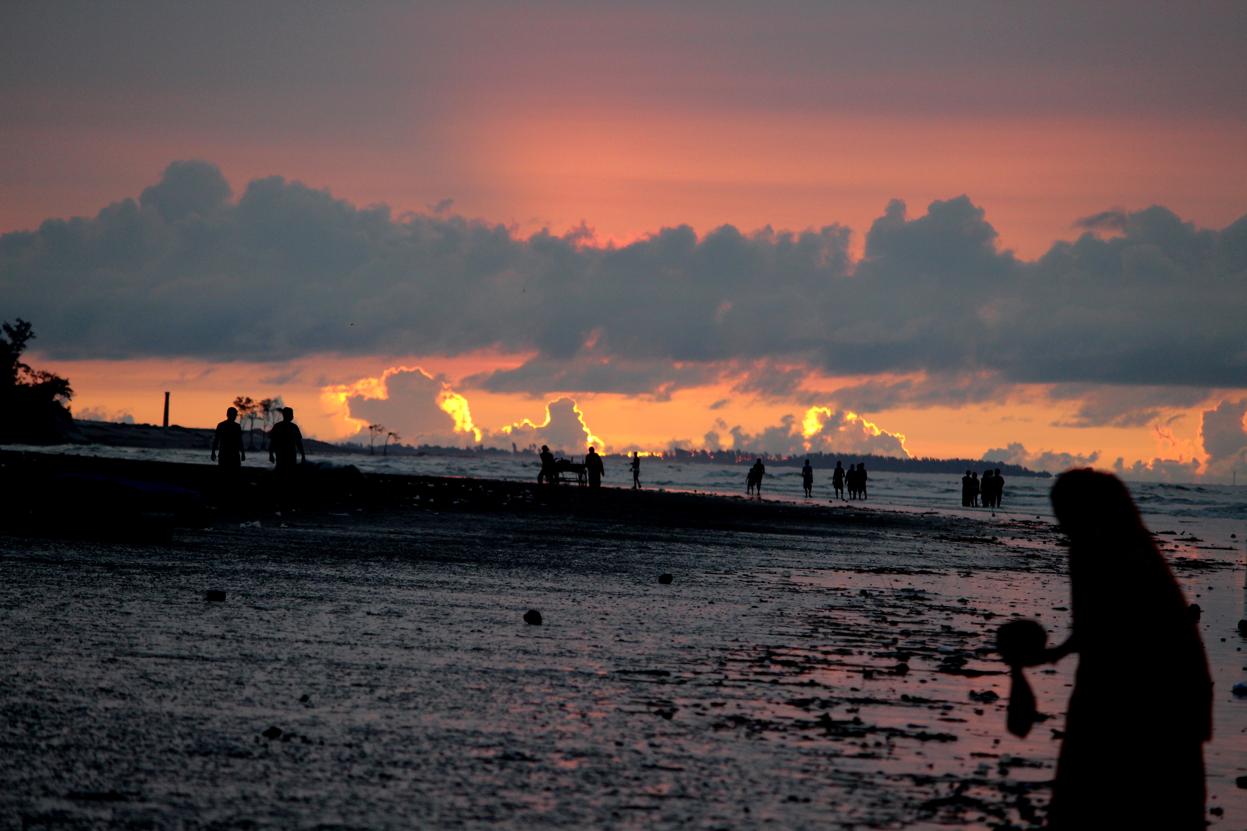 Quickly I picked up my camera and started to walk along the road that goes to the beach . Some other people were also going to the beach . It was already 5 o’clock and the sunrise time was around 5.15 a.m. It was almost a kilometer or so from my staying place to the beach . I was lucky to get a van rickshow at that hour in the morning to get to the beach .
