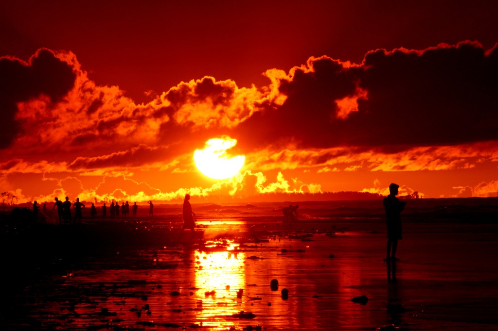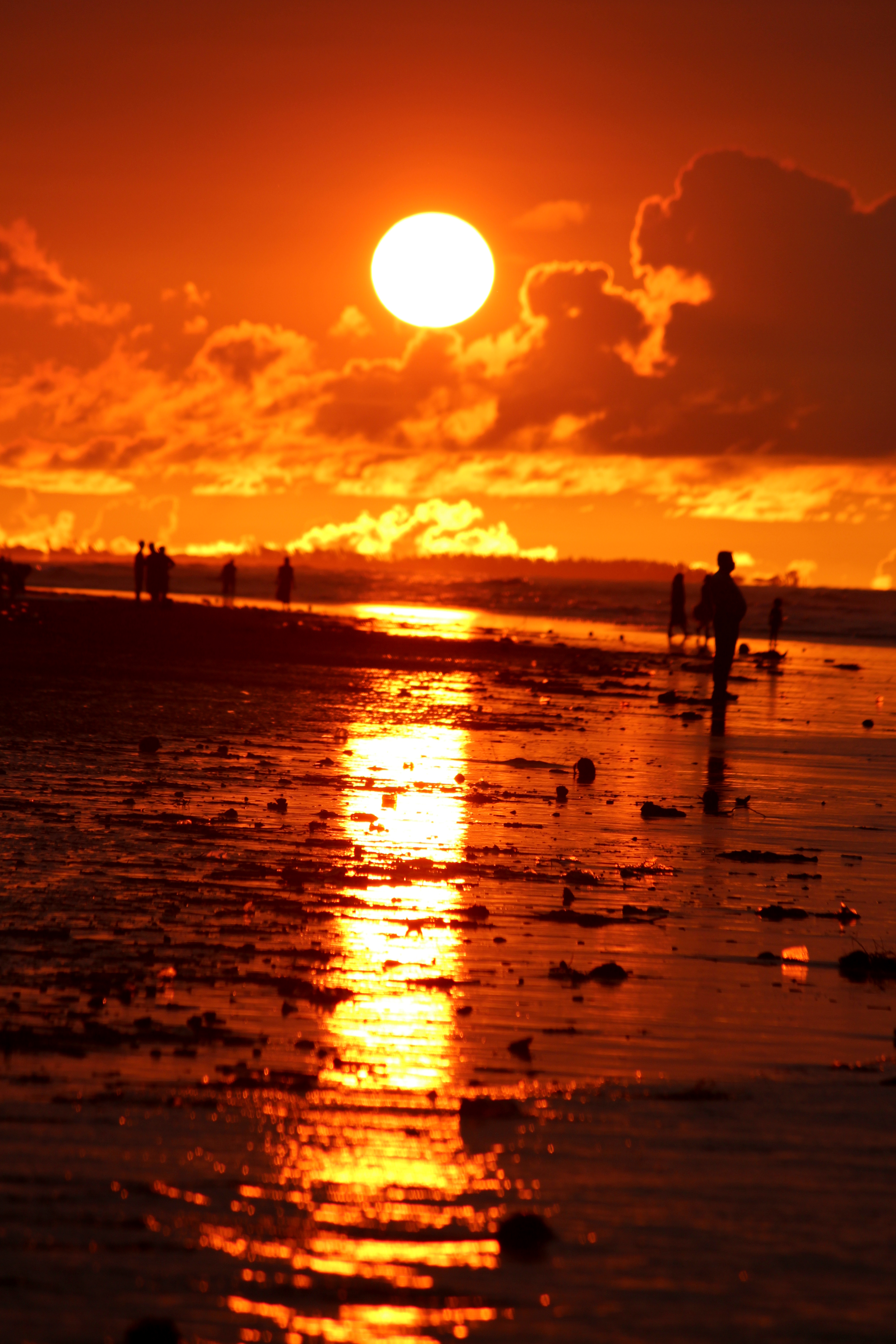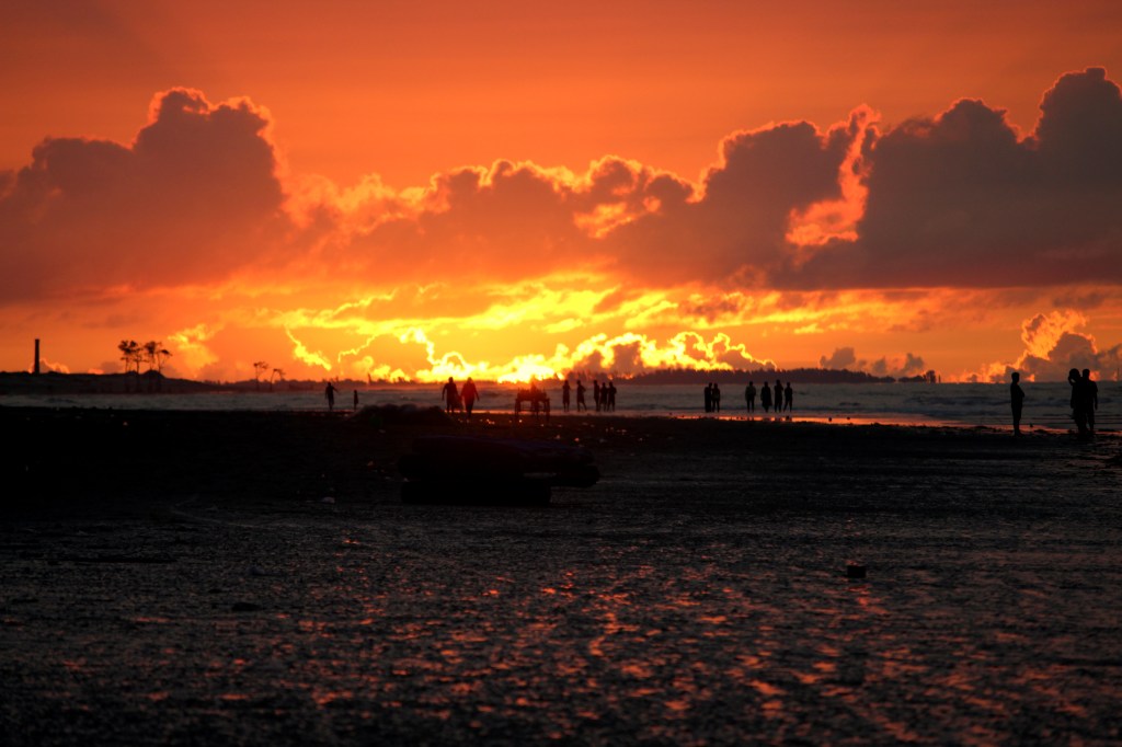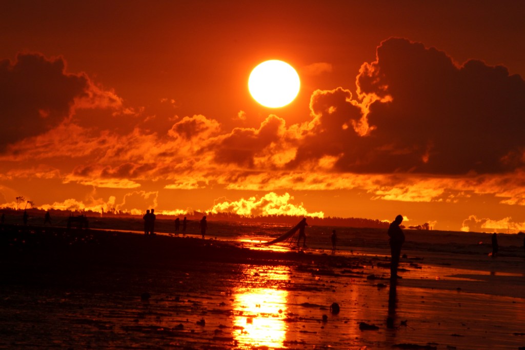 Wow ……… The sky looks so beautiful .It is a bit cloudy which brings a doubt in my mind – will I be able to watch sunrise this morning ? But the freshness of the morning with its bright colours makes the East sky just wonderful .Have a look at the golden lining of the cloudlets .It is just amazing . The contrast between the red sky and the dark beach makes it more vibrant .