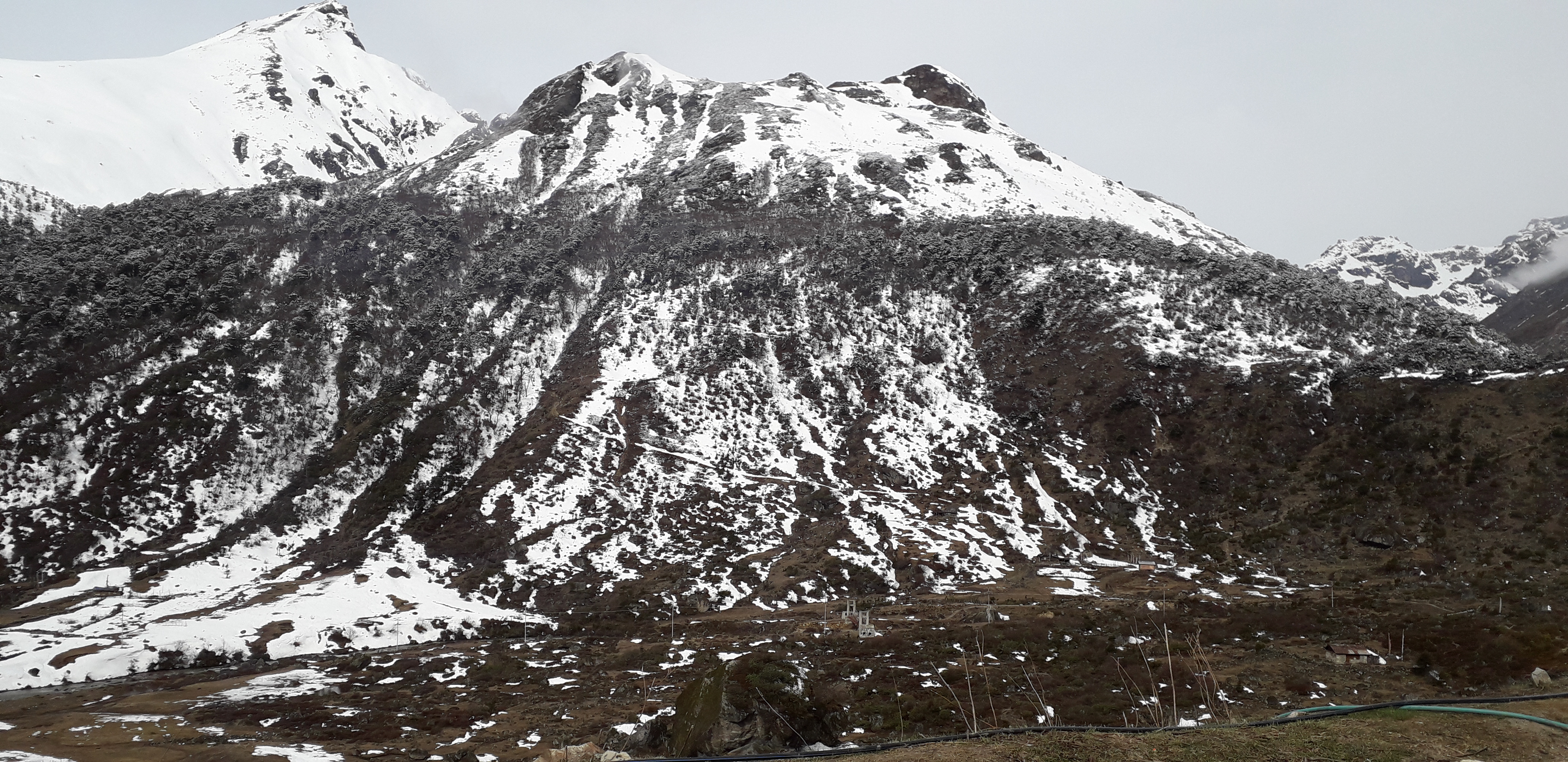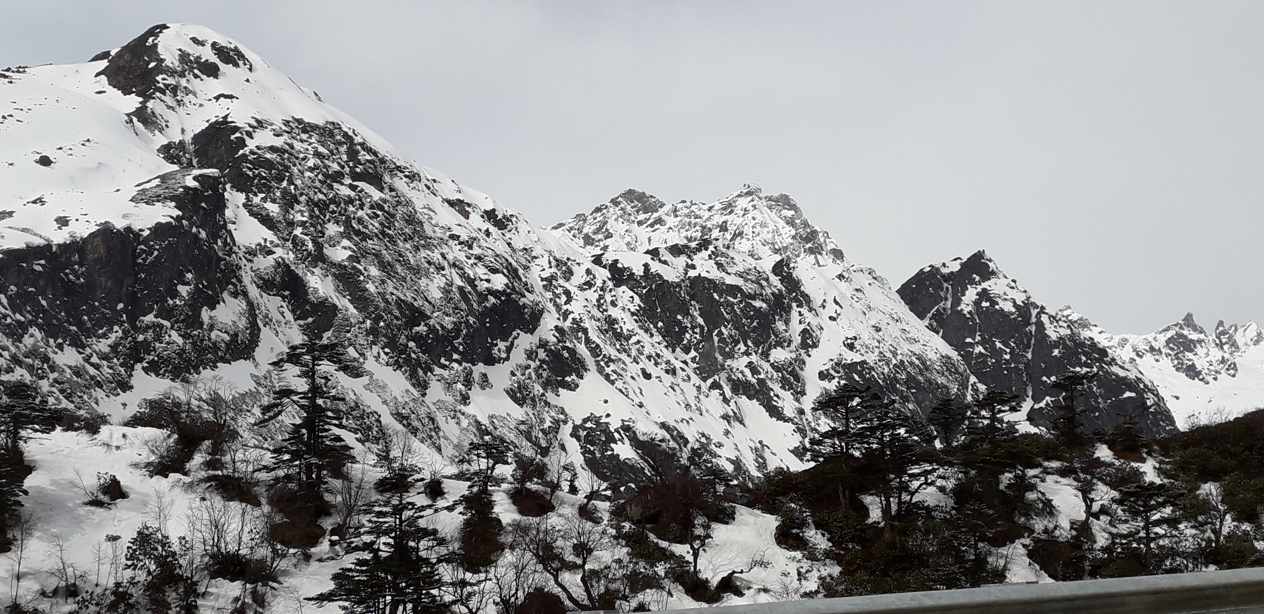 One can distinctly notice the change in foliage as we get to Thangu. From green forests or large trees, the foliage changes to mostly smaller bushes.One can see either brown soil of the mountain or the white snow or the blue sky .