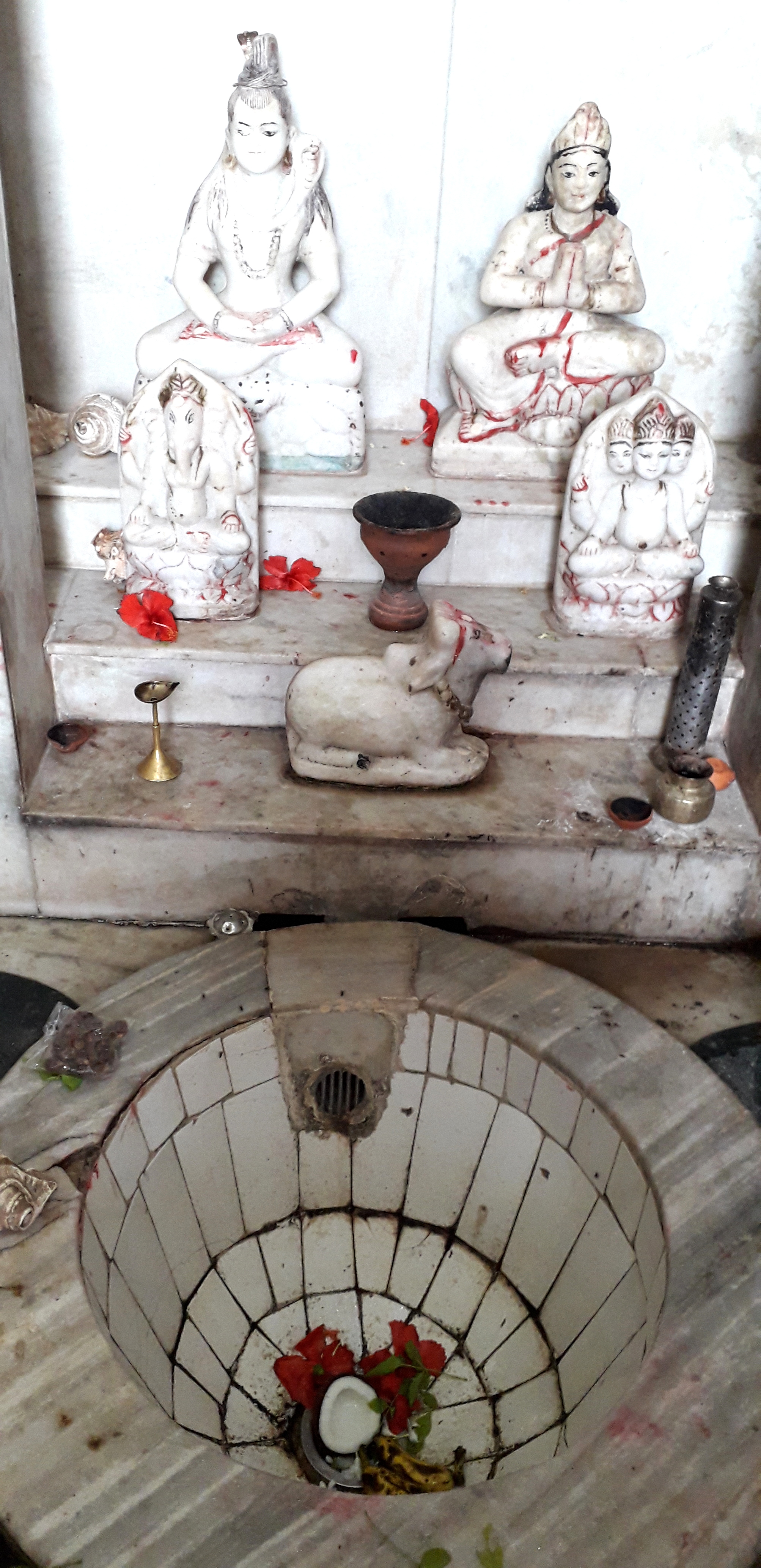 Inside of the temple is very small .One can notice the white marble statue of Lord Shiv and Goddess Parvati placed side by side . There is no Shiv linga inside the temple . In front of them Lord Ganesh is placed in the left and Lord Brahma is placed in the right .Even in front of them a statue of Nandi ,the bull of Lord Shiv is placed .